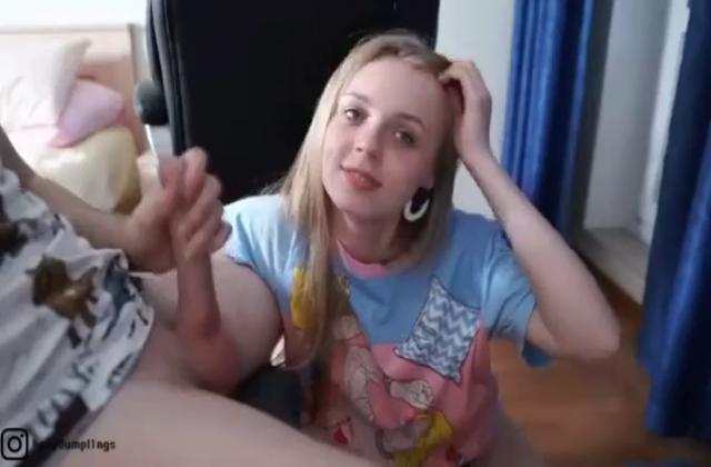 Молодая 18 летняя русская блондинка на веб камеру с улыбкой ведёт прямой эфир и сосёт нежно в домашних условиях член своего парня и мастурбирует с финалом в рот.